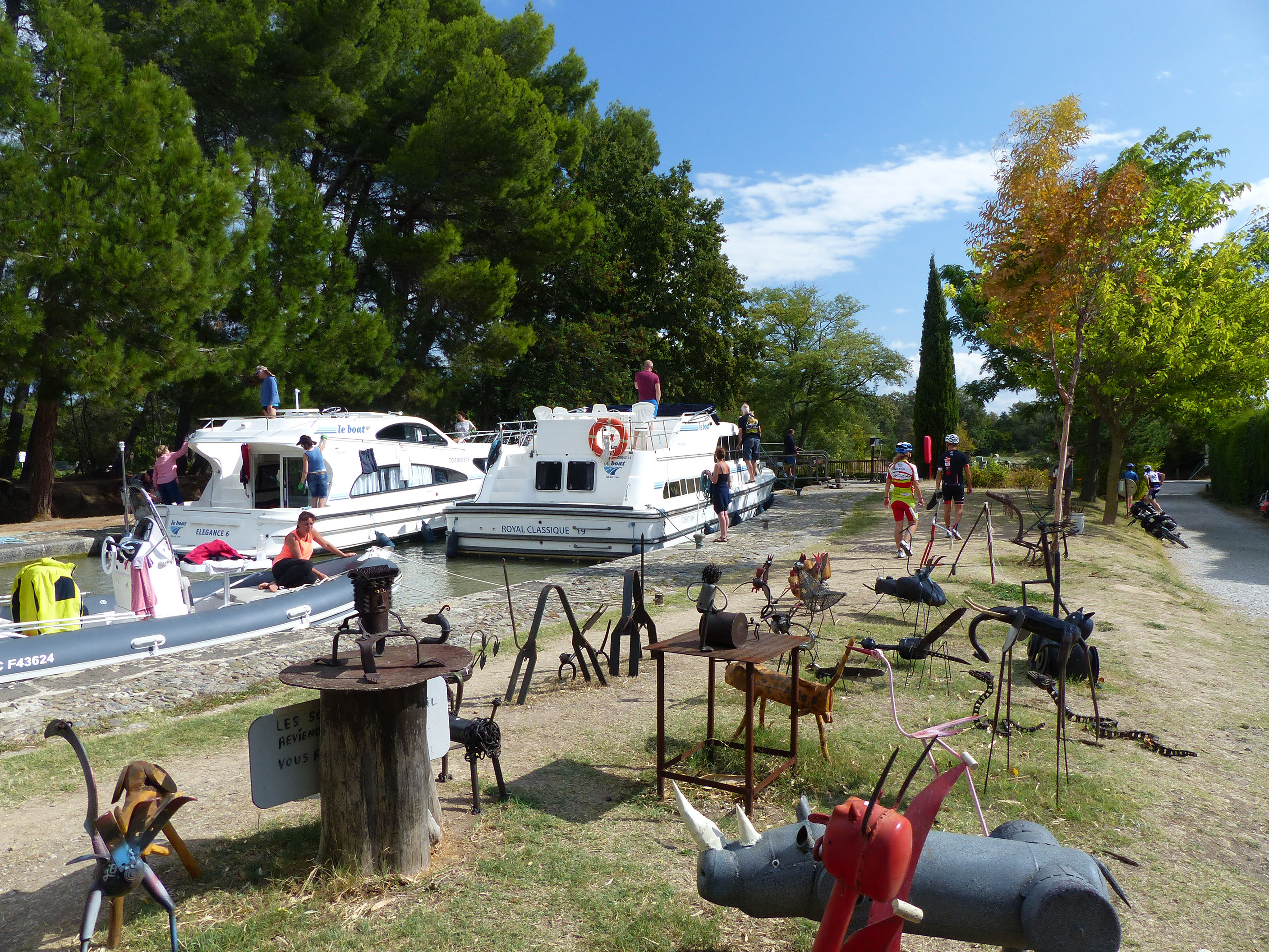 Prenez le temps d'explorer Carcassonne ce matin car le meilleur endroit pour déjeuner aujourd'hui est à seulement 15 km. Cet endroit est le vieux village de Trebes avec son port fluvial animé. Le Minervois et le célèbre vignoble ne sont qu'à quelques pas du Canal du Midi. Parcours cyclable, interrompu par des œuvres d'art, notamment à La Redorde avec la surprenant épanchoir de l’Argent-Double qui permet d’assurer le trop plein du canal. Homps, ancien port viticole, très fréquenté, avec de nombreux commerces et restaurants, nous tire soudain de la beauté du Canal du Midi et nous rappelle que nous sommes désormais au cœur du Minervois. Près de Homps, le Lac de Jouarres sera l'occasion de se baigner.